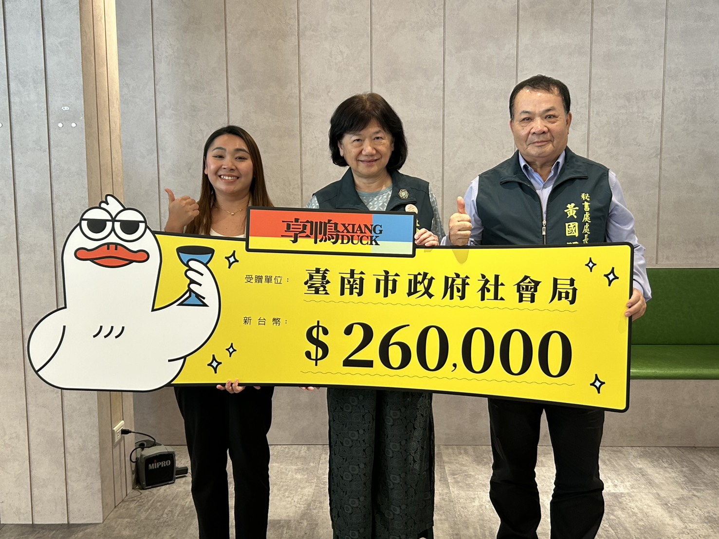 ▲王品集團旗下享鴨餐廳區經理羅詩庭代表王品捐贈26萬元給臺南市社會局用來支持兒少據點。(記者黃雋淮 攝)