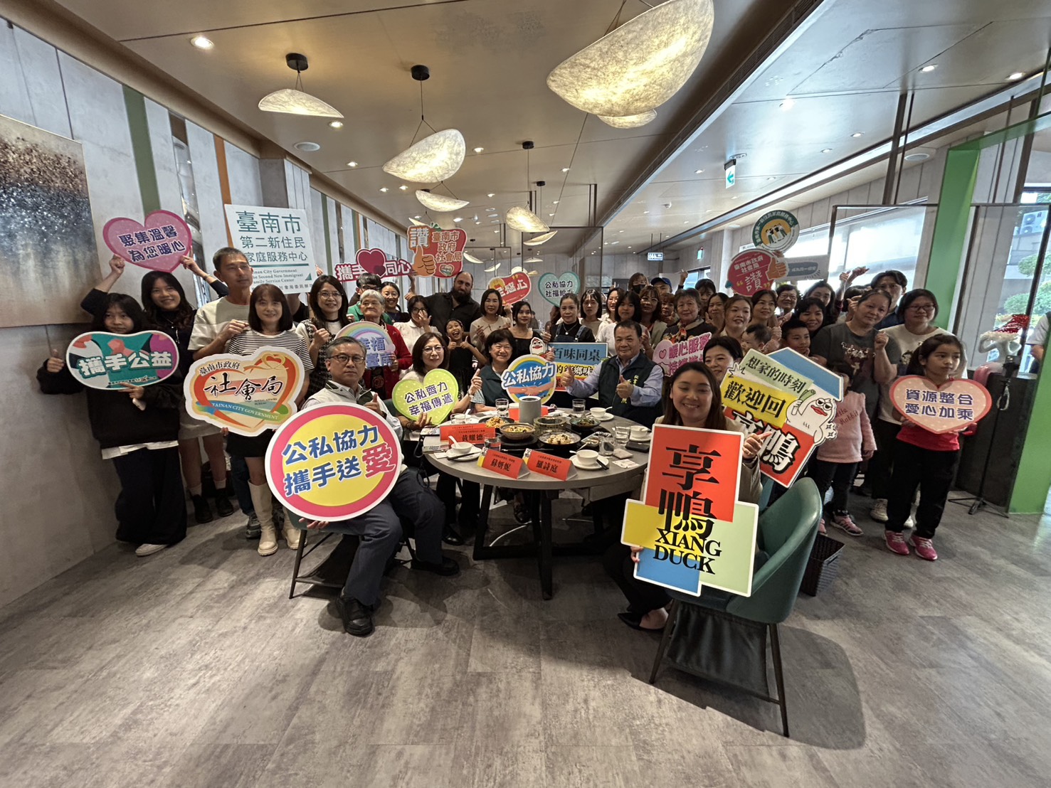為響應臺南市「照顧弱勢優先」的政策精神,享鴨再度攜手臺南市政府社會局,今(24)日於享鴨臺南市官邸店辦理「2025年分享餐桌-百味同桌 不同的家鄉味,一樣的人情味」公益餐會,社會局郭乃文局長及秘書處黃國照處長代表黃偉哲巿長一同出席,邀請80位新住民家庭成員齊聚一堂,共同品嚐溫馨美味的烤鴨饗宴。為延續這份溫暖,王品享鴨此次除捐贈新臺幣12萬元作為公益餐會之活動費用,同時捐贈14萬元至社會局救助金專戶,支持兒少社區關懷據點及相關服務,期盼以實際行動持續傳遞關懷,為新住民家庭帶來更多力量與支持。