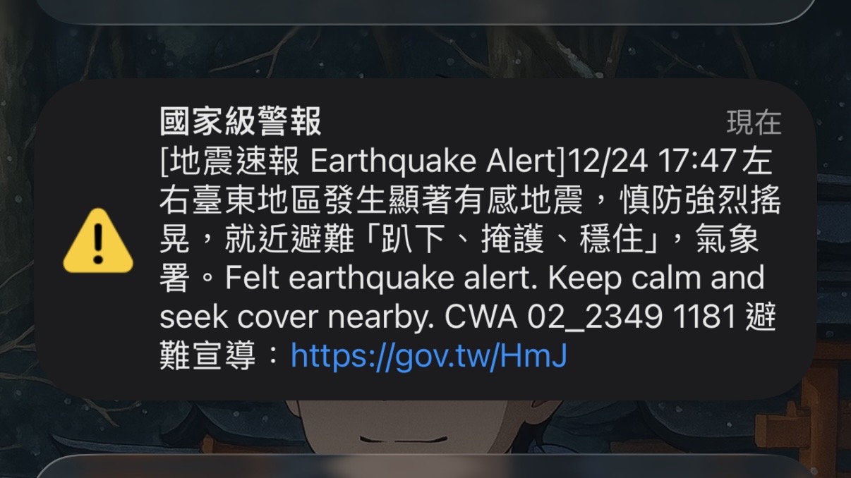 因為這起地震規模大、範圍廣,氣象署也啟動災防告警系統(PWS),針對包括台東、花蓮、屏東、台南、高雄、台中、嘉義、雲林、南投、彰化、苗栗、宜蘭、桃園、新竹、新北、台北等縣市在內的多地同步發出地震警示,手機警報聲響遍全台,許多民眾嚇到衝出室外避難。