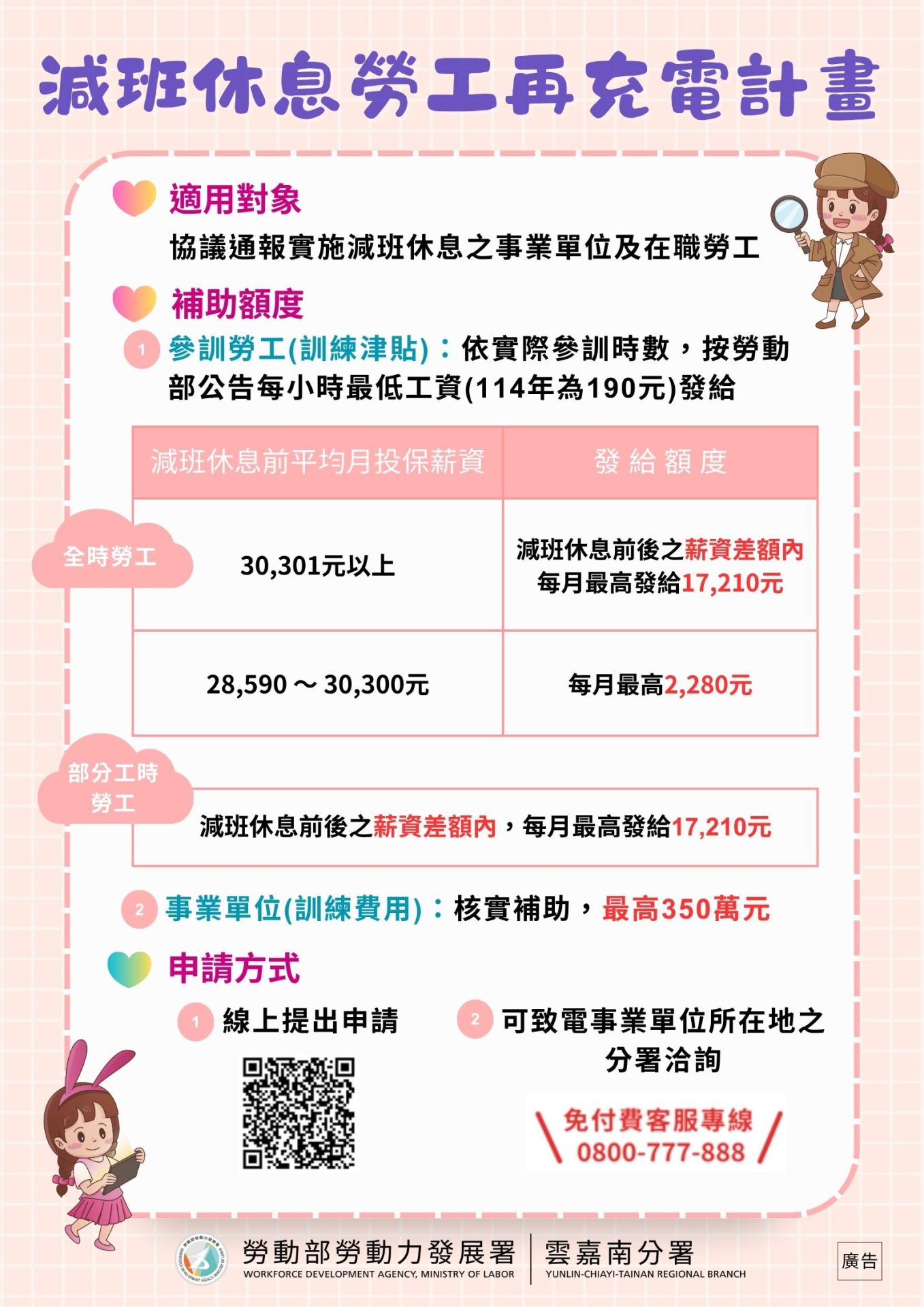 南分署進一步說明,即使勞工受僱公司未符合僱用安定措施適用9大行業別,勞工仍可參加「減班休息勞工再充電計畫」,並依減班前後的薪資差額申請訓練津貼,每月最高補助1萬7,210元。另針對全時工作的基層勞工,若減班前勞保平均月投保薪資介於2萬8,590元至3萬300元,且減班後薪資差額較小或未產生差額者,參訓後亦可申請每月最高2,280元的訓練津貼,擴大照顧範圍。
