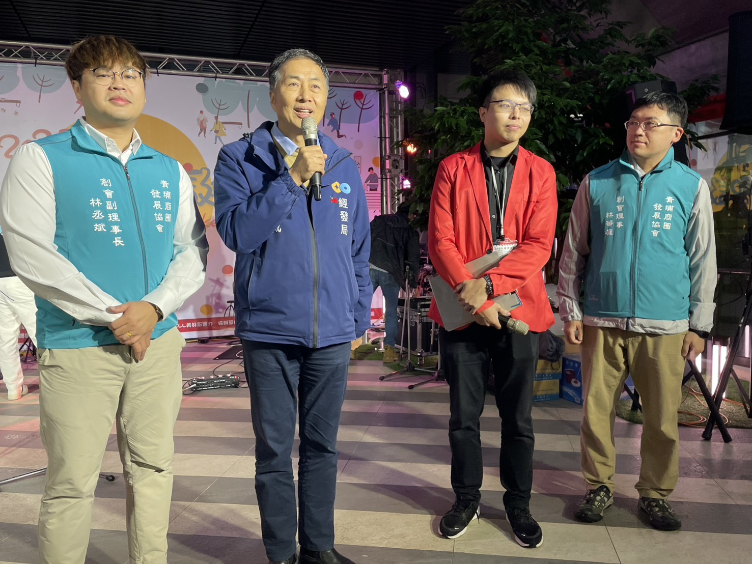 桃園市經濟發展局張誠局長(左二)於參加2025青埔聖誕活動時,對於活動發起人與主持人鍾漢騰(右二)肯定有加。圖/市府提供