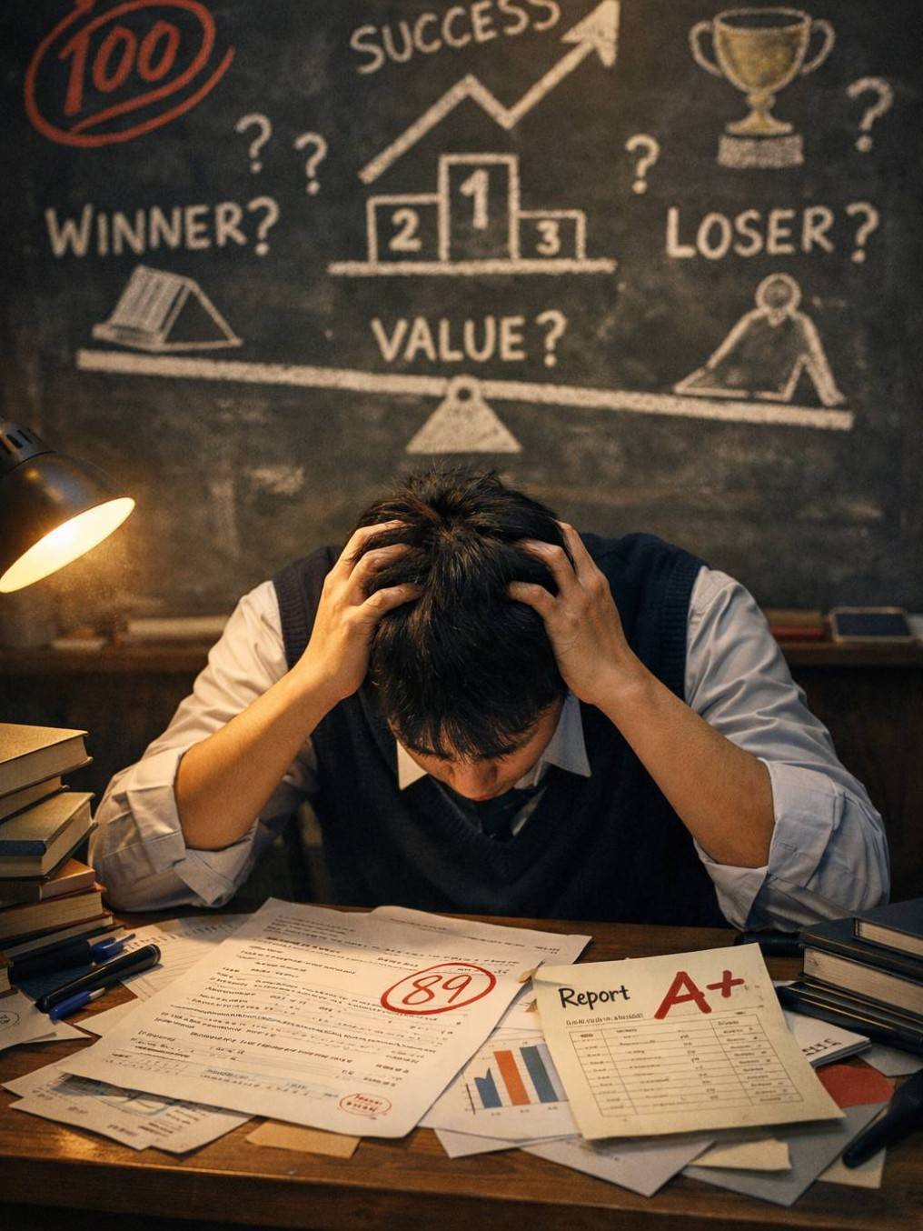 當故事的情緒慢慢沉澱,我也試著切換到另一個角度——一個愛讀書、相信理性思考的人。成績本身真的是問題嗎?或許不是。真正該被檢視的,是我們為什麼如此急著把「分數好」直接翻譯成「人生成功」。