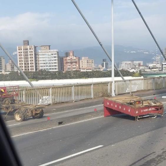 【Lai傳媒、記者爆料網/林千允/新北報導】新北市重陽橋往三重方向今天發生一起離譜車禍,一台本來就不該上路的無牌搬運車(俗稱鐵牛)竟然大搖大擺開上橋,結果與後方貨車發生碰撞,搬運車翻覆橫躺路中央,快慢車道全部受影響,害用路人塞到爆炸。有網友怒PO文直呼「當成吃了鐵牛運功散」,痛批這種車根本不能上一般道路。