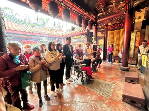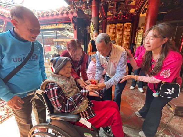 百歲失能的力鄂奶奶,罹患心臟病與腦血管堵塞導致需長期臥床,需靠家人照顧。自114年起,華山基金會提供到宅訪視、年節關懷、物資協助等免費服務,透過定期陪伴與支持,減輕家庭經濟負擔、給予照顧者情緒支持,開場由小朋友幼兒園帶來新春舞蹈、蔡爺爺開心揮毫手寫春聯「華山濟世 悲憫孤老」祝福賀新春;旗山天后宮邀請8位長輩前往參拜點燈祈福,宮廟旁的鄭家陽春麵深受感動現場捐助孤老年菜三千元及參拜媽祖的民眾也捐款共計玖千元,伴手禮由盟承投資開發有限公司捐贈平安龜愛心米80份;目前獨老年菜尚待募集中,邀請大家一起愛老人。