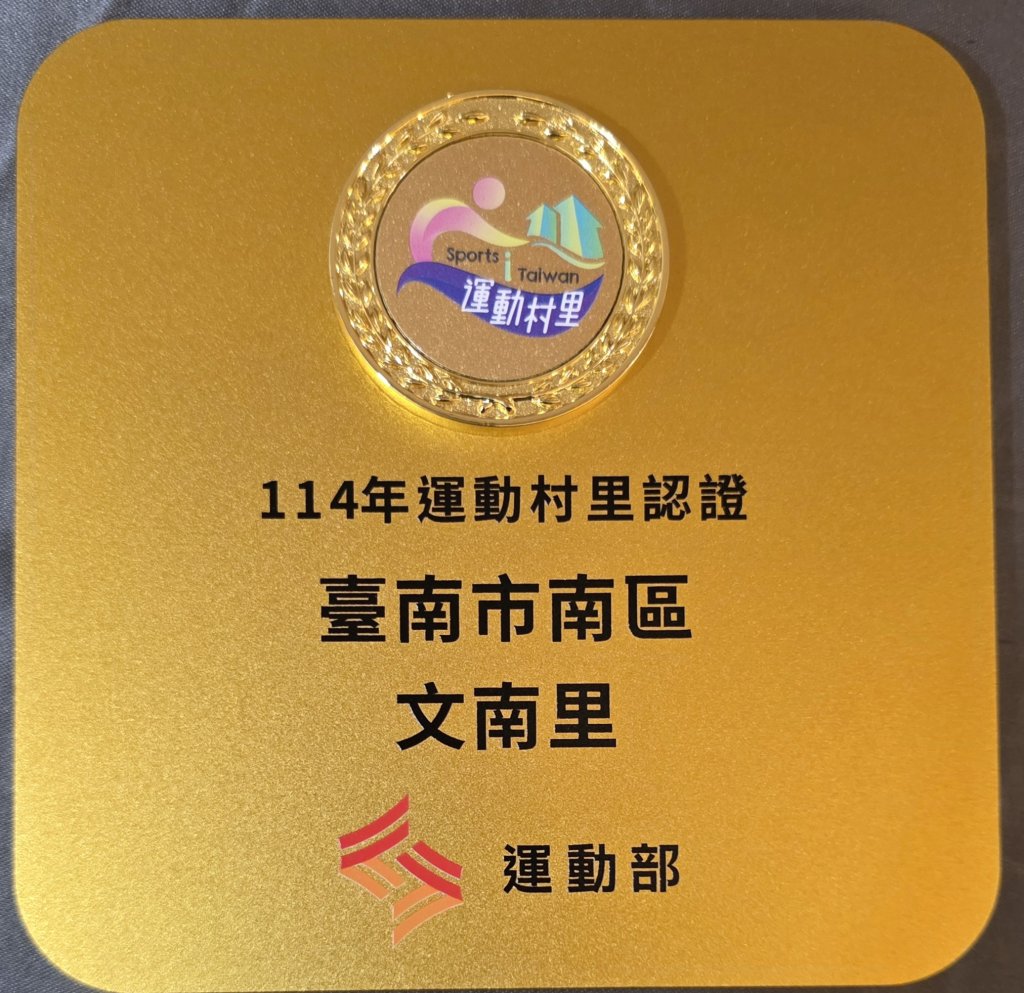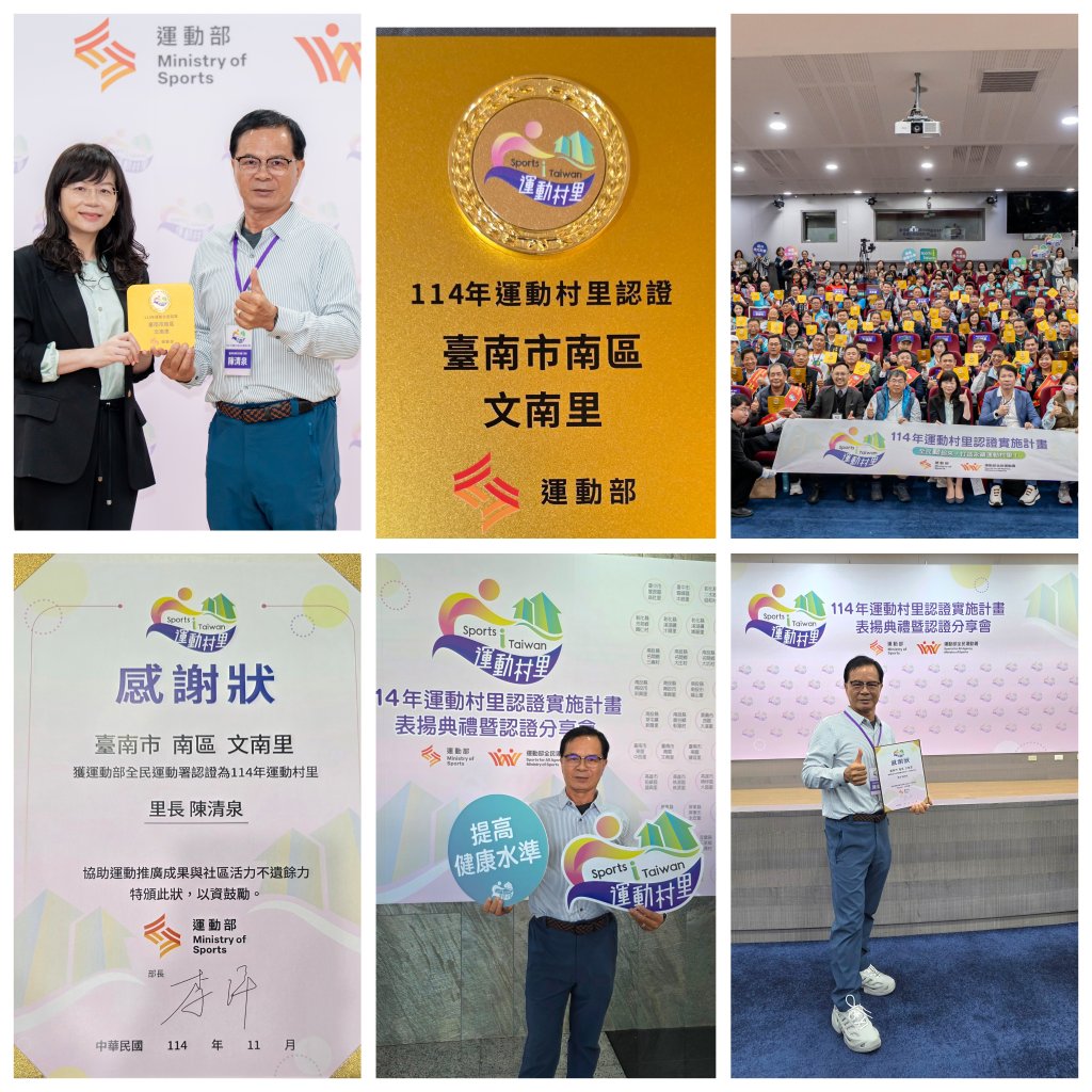 運動部全民運動署主辦的「114 年運動村里認證」結果公布,今年共有 214 個村里通過審查。台南市南區文南里成功獲得認證,里長陳清泉並於 11 月 26 日出席表揚典禮與認證經驗分享會。