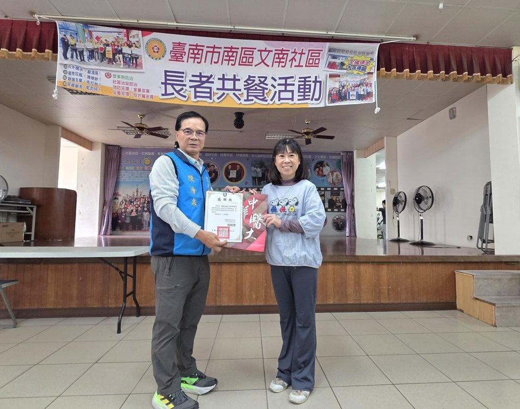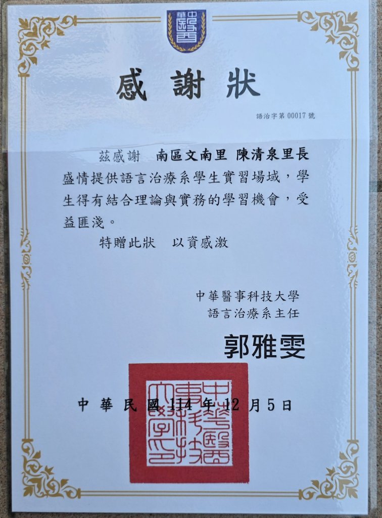 文南里社區關懷據點長者共餐活動 邀請中華醫事科技大學建教活動合作致贈感謝狀 內容:兹感謝南區文南里陳清泉,盛情提供語言治療系學生實習場域,學生有結合理論與實務的學習機會,受益匪淺 特贈此狀,以資感激 感謝:正覺基金會協助,有你真好!