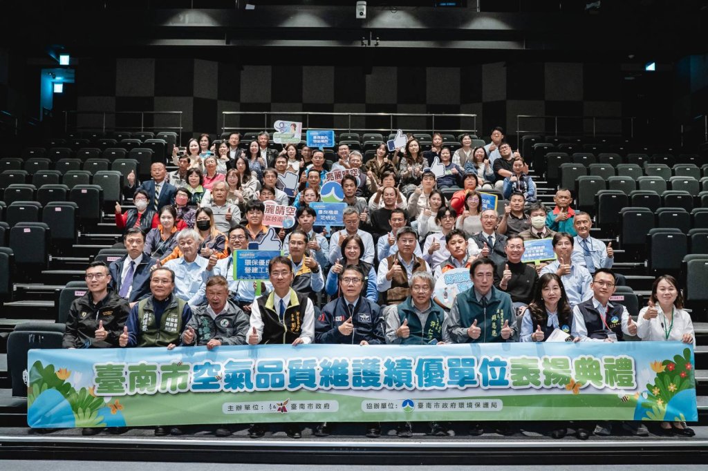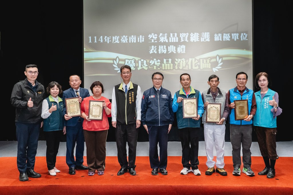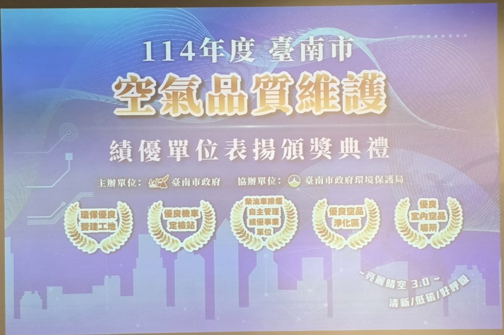 為維護市民優質生活環境,台南市政府攜手民間單位戮力推動空氣品質優化,於臺南市美術館二館舉行「114 年度臺南市空氣品質維護績優單位表揚典禮」,由市長黃偉哲親自表揚。