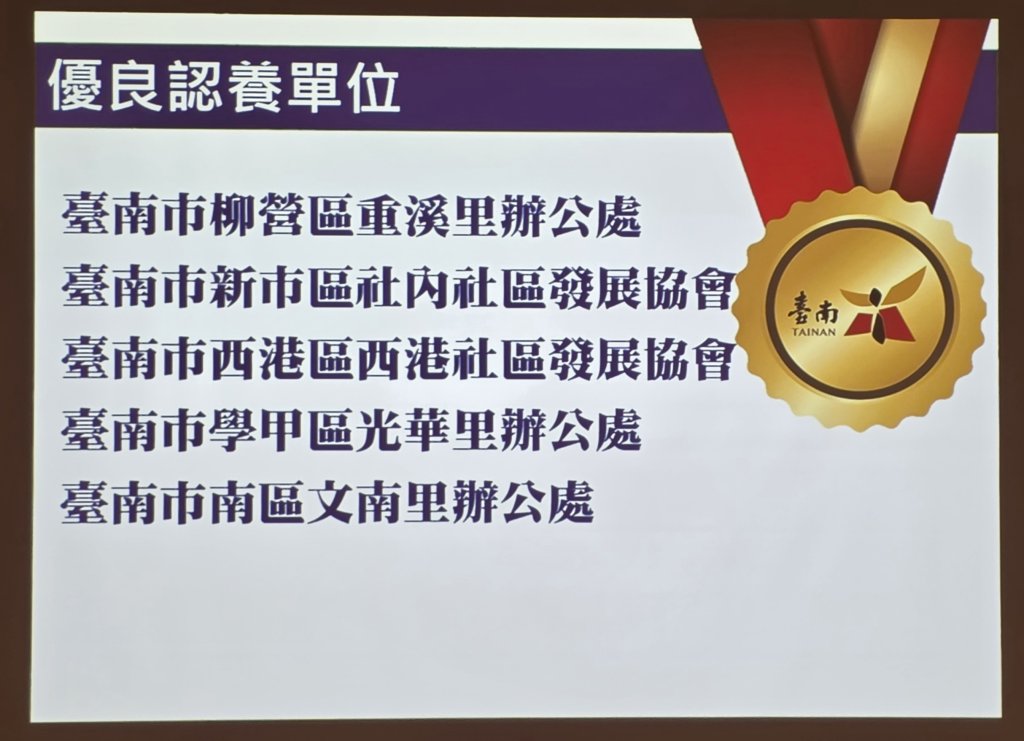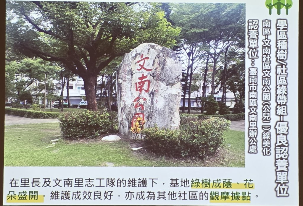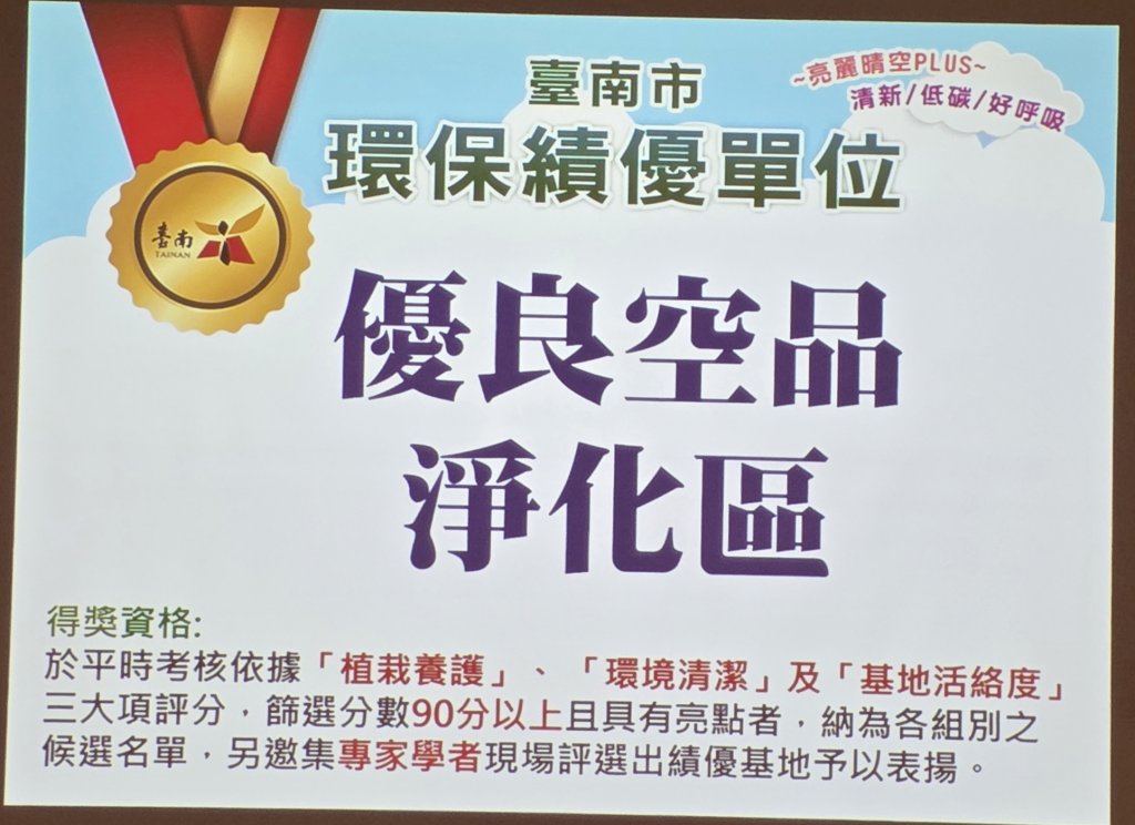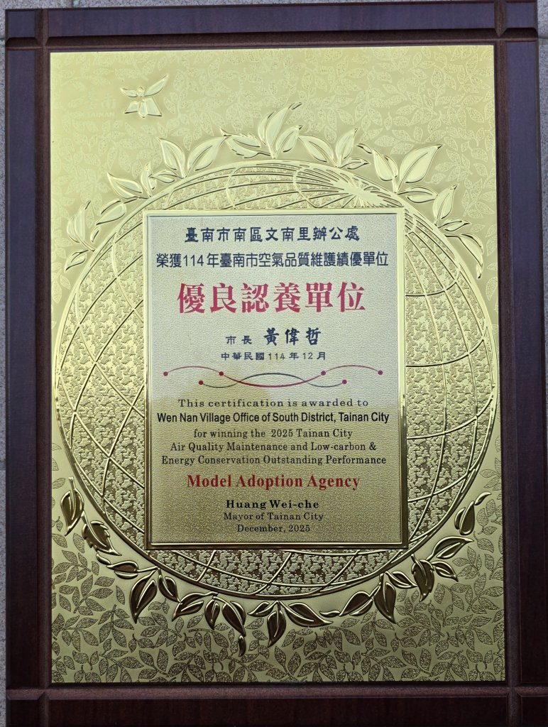 台南市南區文南里辦公處,榮獲114年臺南市空氣品質維護優良認養單位。