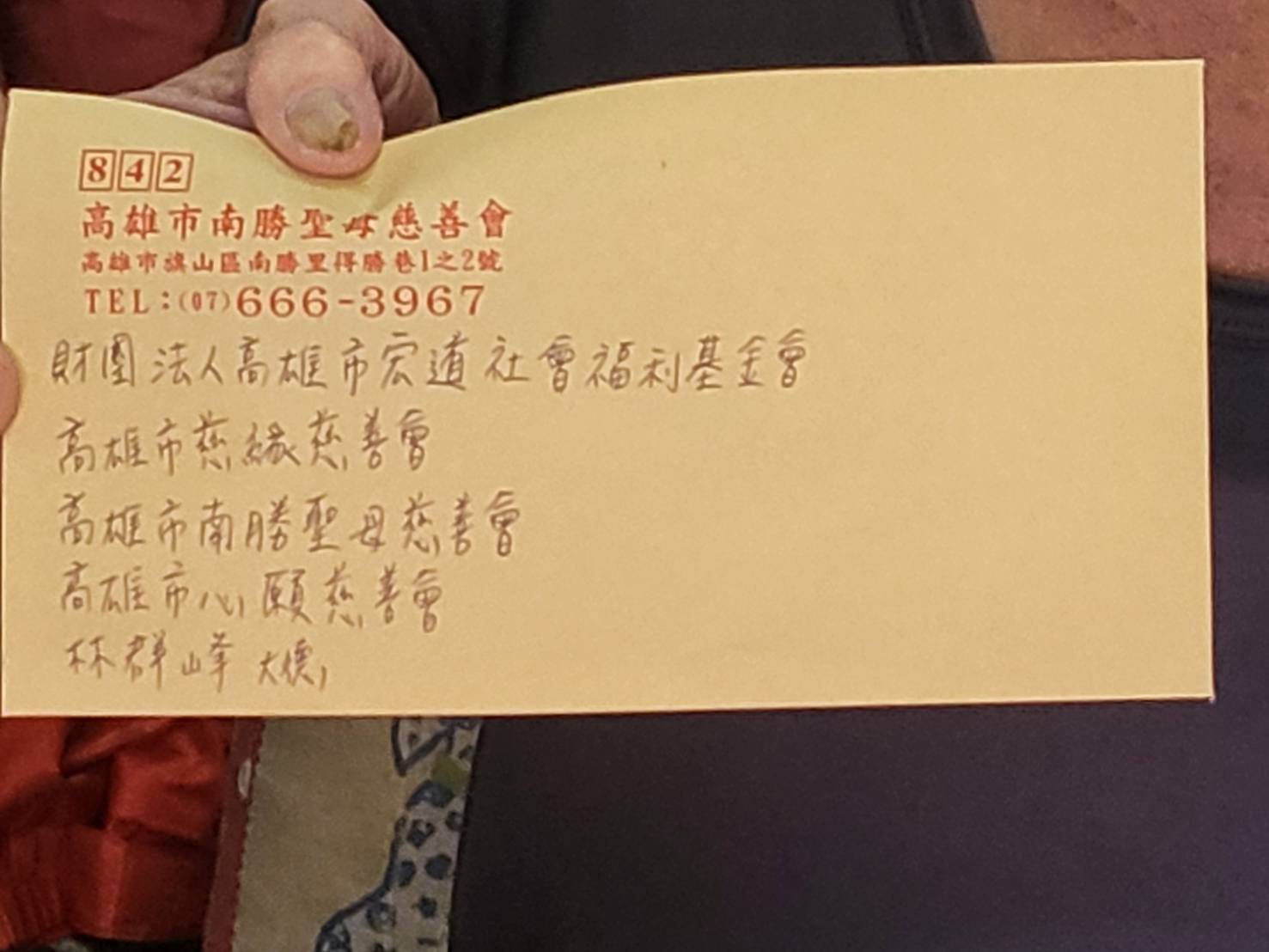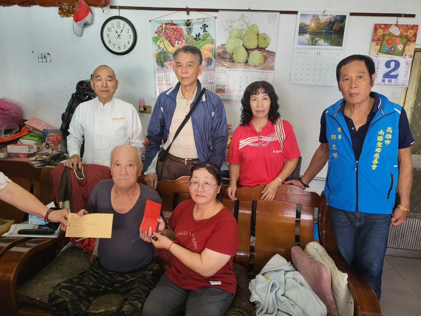 在得知情況後,財團法人高雄市宏道社會福利基金會、高雄市慈緣慈善會、高雄市心願慈善會、林群峰大德、高雄市南勝聖母慈善會、邱志明理事、蔡師兄及南勝聖母堂副堂主等善心團體共同展開關懷行動,攜帶慰問金與物資前往探視,由月眉里官梅英里長陪同,希望在張先生面臨健康與經濟雙重挑戰時,提供即時且實質的幫助。