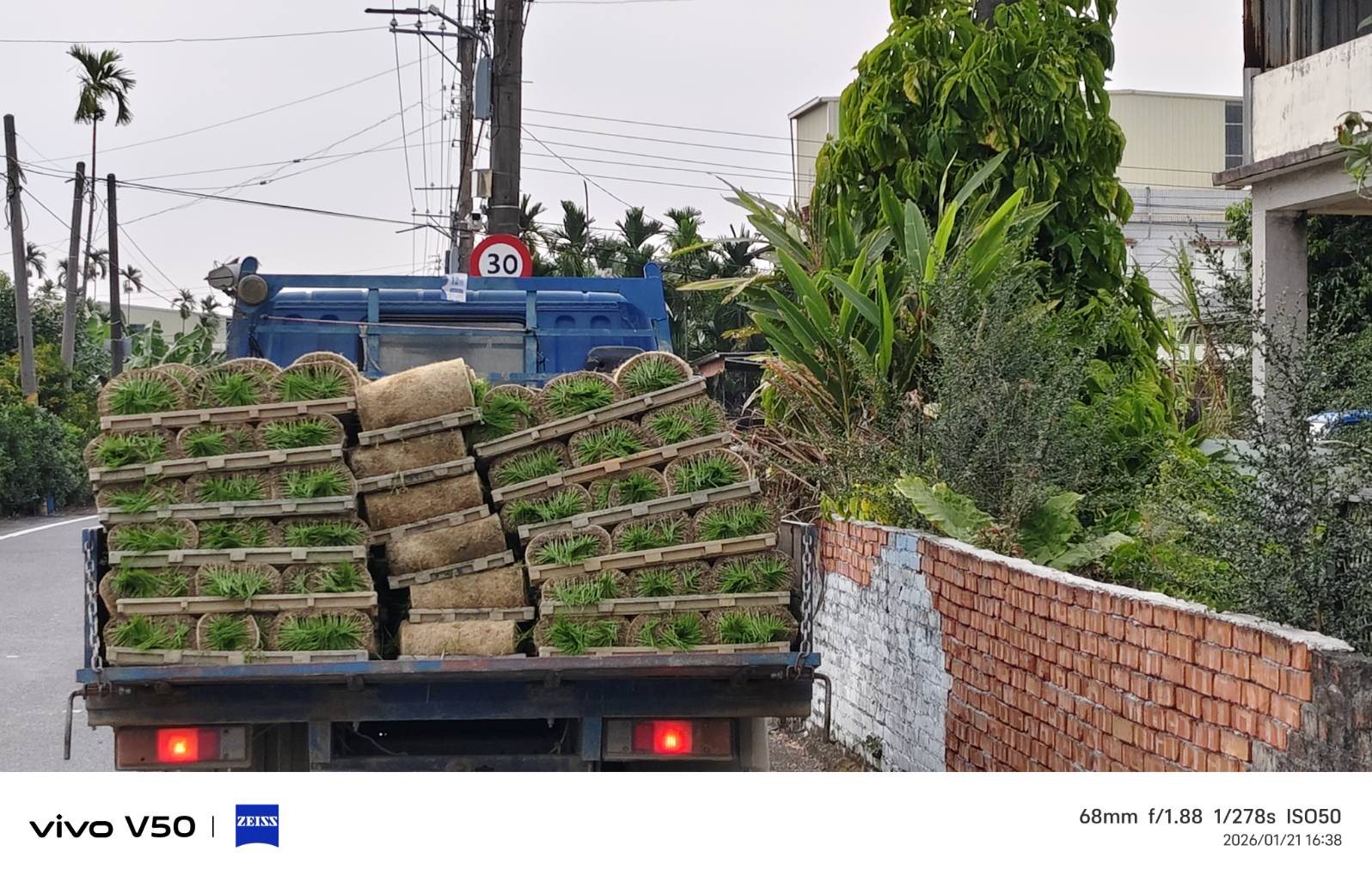 貨車載著一車秧苗,確實很豐盛的感覺。經過秧苗田,好像全出售了。也許是接受預約,限量栽培的,一月的屏東鄉間,就是這個場景!