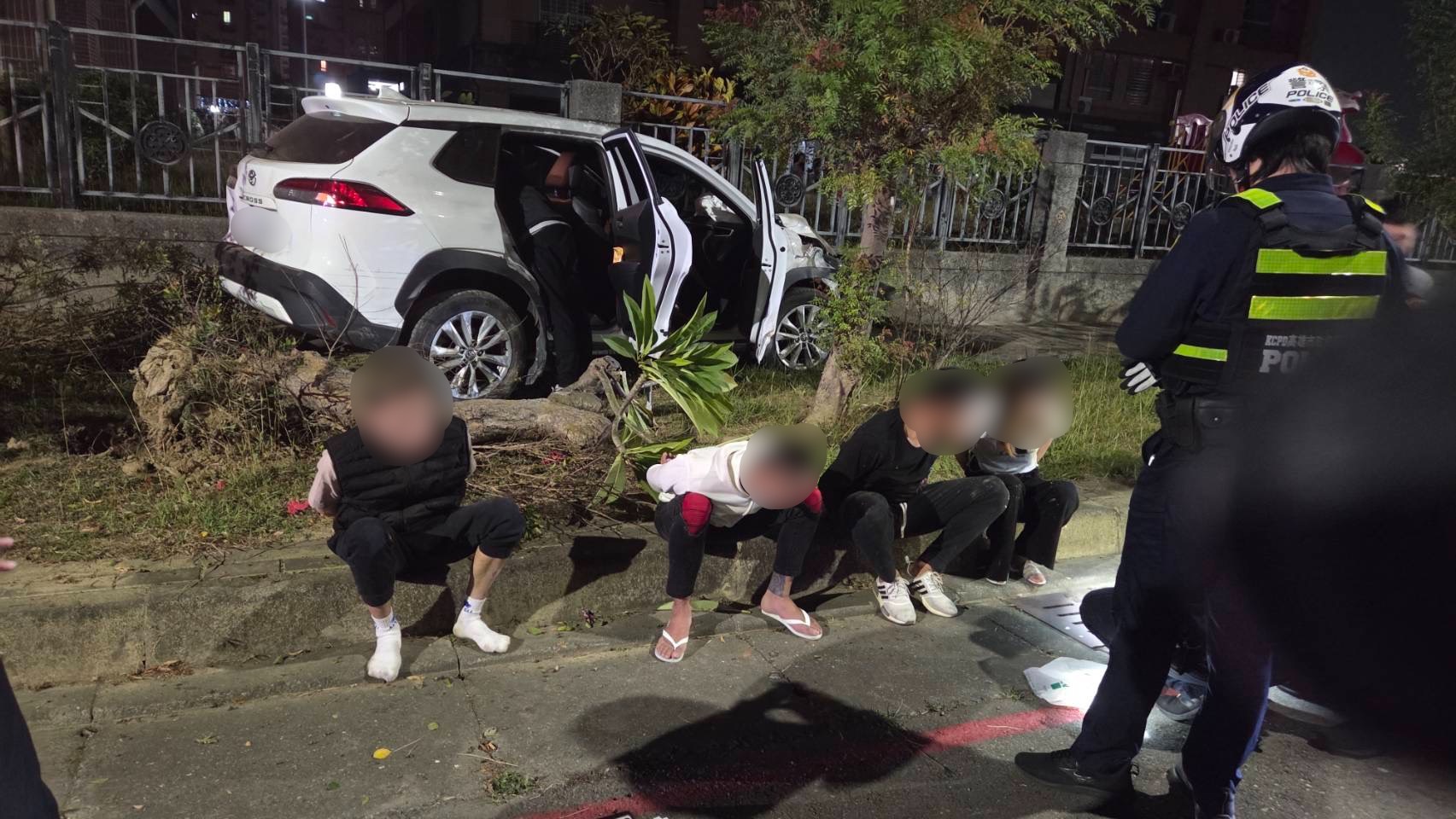 警方到場時,涉案的白色自小客車已先行離去,警網立即尾隨查處,雙方就這樣演變成警匪追逐,該車行駛至緯九路時,疑似因不明原因先擦撞路旁停放的小貨車,隨後再自撞路樹。警方迅速控制車上4名年約20歲的男女,並實施人車分離檢查。