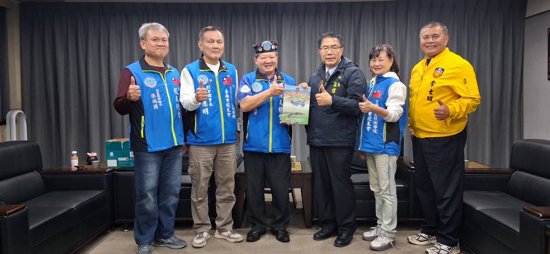 空軍航空技術學院校友總會長廖盛芳(挑大師),率空軍地勤榮民生命史作者代表,張媽國(南區總召)、蒲德明(臺南市校友會理事長)、毛明華(臺南市校友會總幹事),及慢壘隊胡瑞忠代表(臺南市陸軍專科學校常備士官班校友隊領隊)一行五人,連袂拜會臺南市長黃偉哲。該總會長期涉民間公共事務,公開場合與黃市長常有互動,但這次是首度拜訪,盼市長黃偉哲能將空軍地勤榮民生命史能進市府典藏。