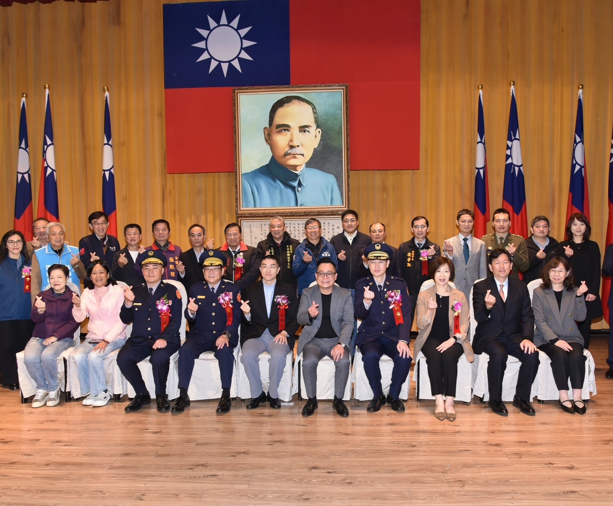 市長謝國樑、議長童子瑋、議員、第三分局及第四分局局長及新任官等同仁大合影。圖/何明弘翻攝