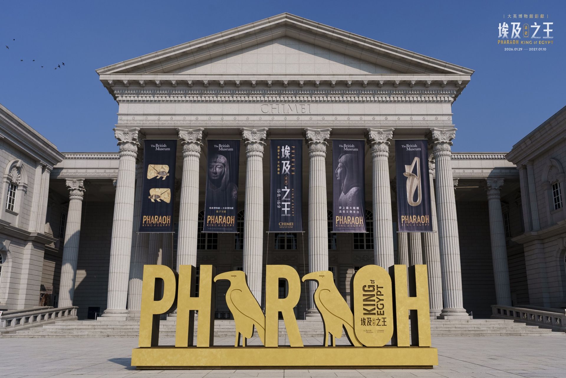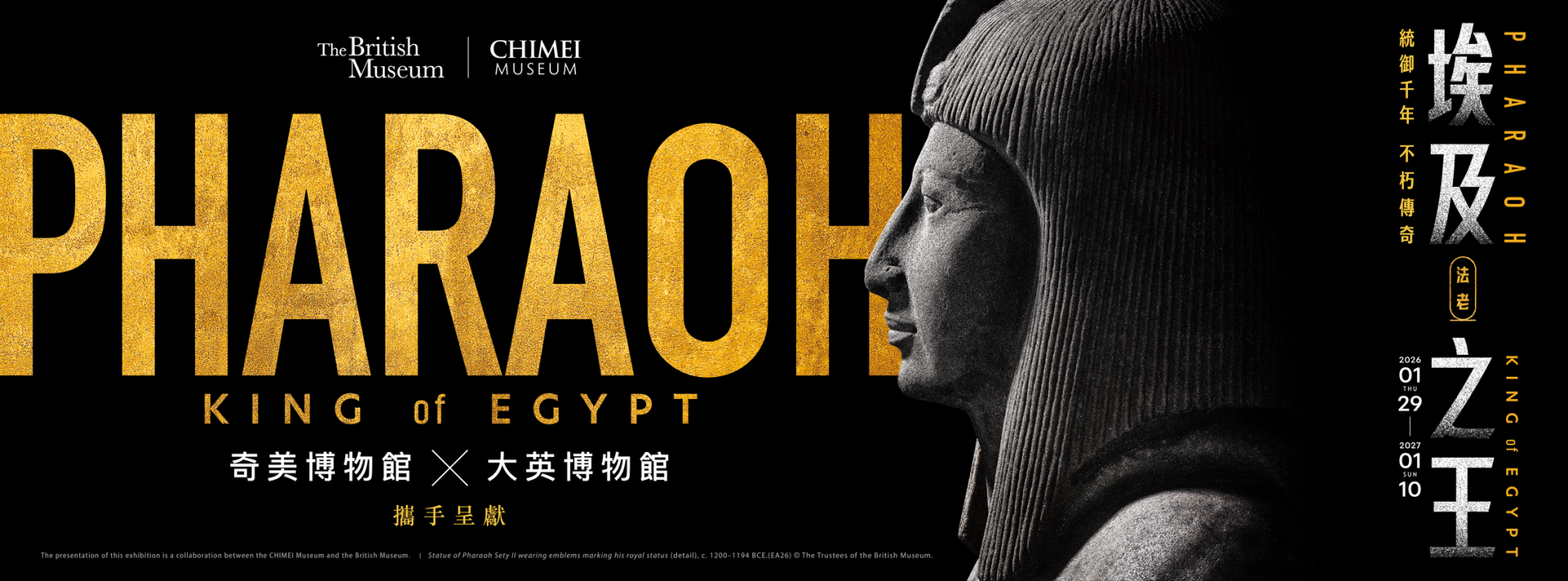 《埃及之王:法老》展期自2026年1月29日至2027年1月10日止。票價為全票580元、優惠票480元、週三藝享票2,000元,民眾可於現場或官網購票。已購票者可透過官網預約「快速入場」服務,以節省排隊時間。館方另推出親子導覽、定時專人導覽及免費語音導覽服務,並同步推出多款展覽周邊商品與大英博物館限定禮品,詳情請至奇美博物館官網:www.chimeimuseum.org。