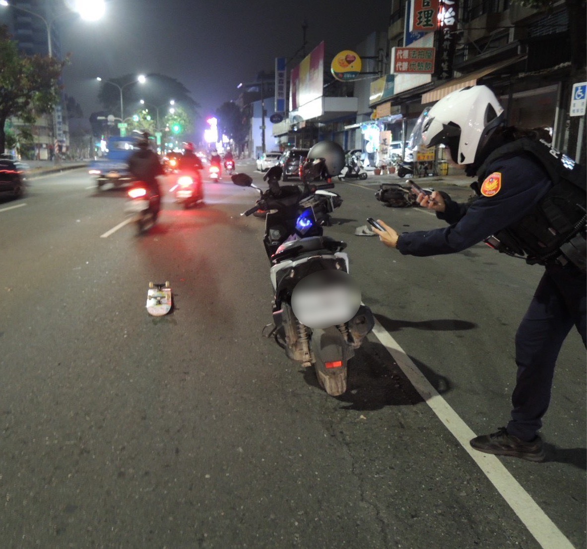 警方指出,當時由28歲陳姓女子騎乘機車行駛興楠路,為閃避滑入車道的滑板而急煞,後方23歲林姓男子、24歲江姓男子所騎機車追撞上前,並波及路旁停放的機車。事故發生後,119救護人員到場進行檢傷時,24歲吳姓男子及32歲莊姓女子因閃避不及,也發生碰撞事故。