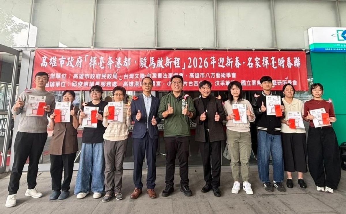 【視傳媒記者吉雄世高雄報導】高雄市政府為迎接 115 年丙午新春到來,特於 2 月 4 日(星期三)上午 9 時 30 分至 11 時 30 分,在高雄市政府鳳山行政中心郵局前廣場舉辦「揮毫奔港都,駿馬啟新程」2026 年迎新春・名家揮毫贈春聯活動。活動由高雄市政府民政局、台灣文聯-台灣書法家協會、高雄市八方藝術學會共同主辦,並獲邱俊憲議員服務處、小樹香片、台吉化工、汶采筆莊、國立屏東大學藝術研究所學會等單位支持,吸引眾多市民朋友到場參與,現場洋溢濃厚的新春喜氣。