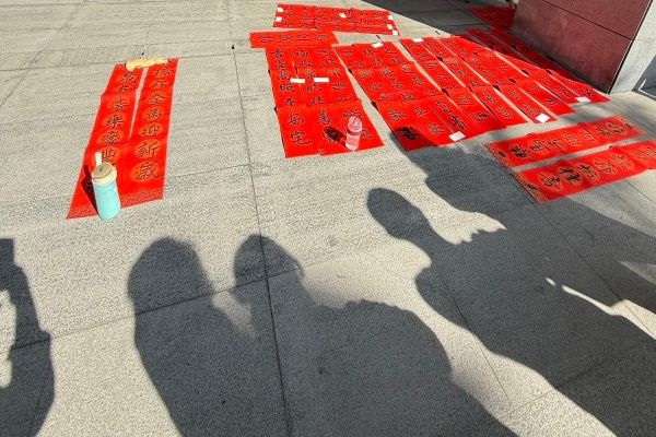 7.新春春聯鋪陳於廣場一隅晾曬,紅紙映著冬日陽光,筆墨與人影交織成迎新春最真實的現場風景。