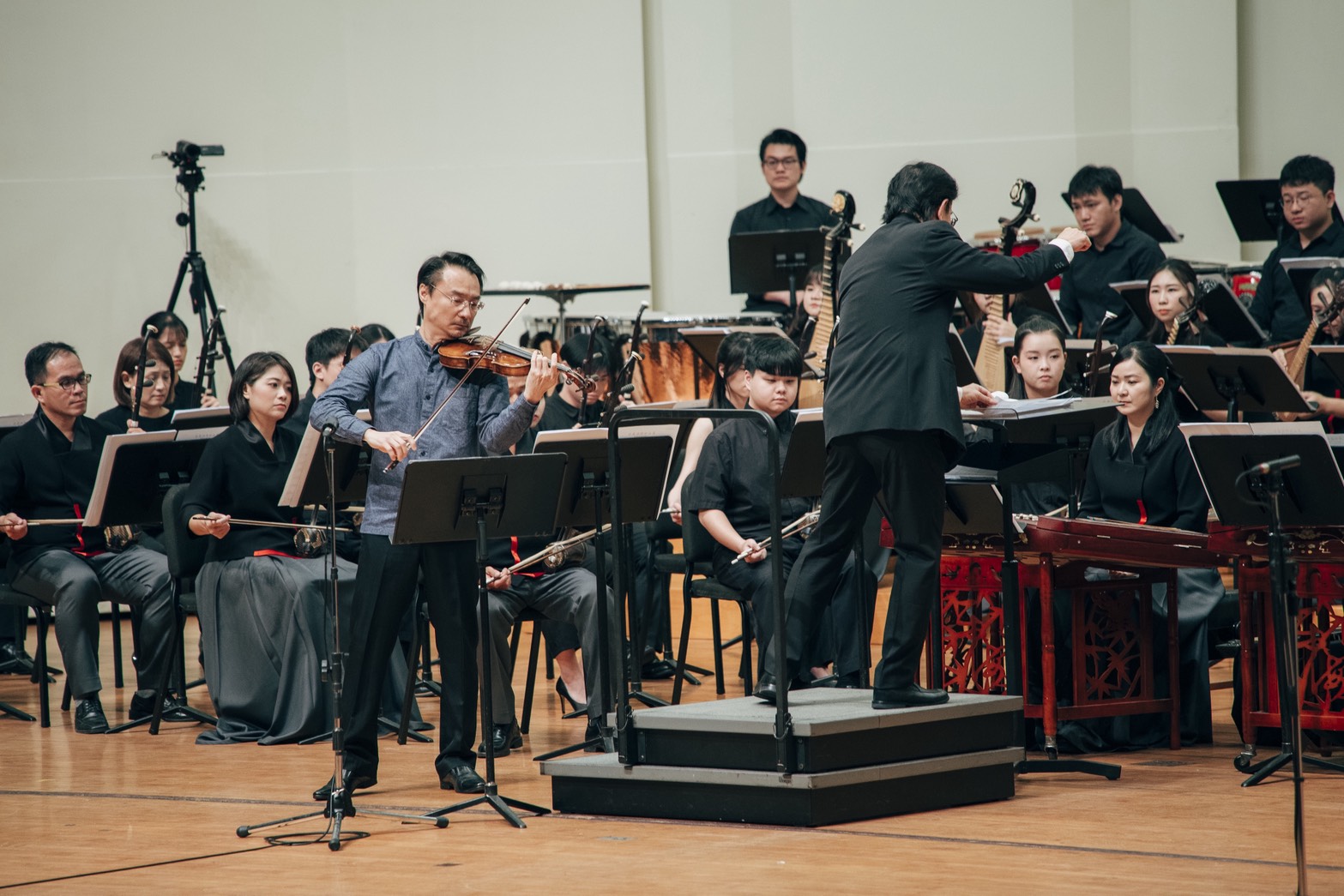 特別的是,長年擔任樂團首席二胡的梁金寧老師,今年中旬即將退休,這場音樂會也成為他以團員身分站上舞台的最後一次演出。二十餘年的歲月裡,他以穩定而深厚的演奏實力,陪伴樂團走過成長與轉型的重要階段,無論在聲部帶領、音樂詮釋或後進提攜上,皆留下不可抹滅的印記。面對舞台與觀眾,他的心情既感動又不捨,樂聲之中彷彿也多了一層歲月沉澱後的溫度,成為當晚最動人的註腳。