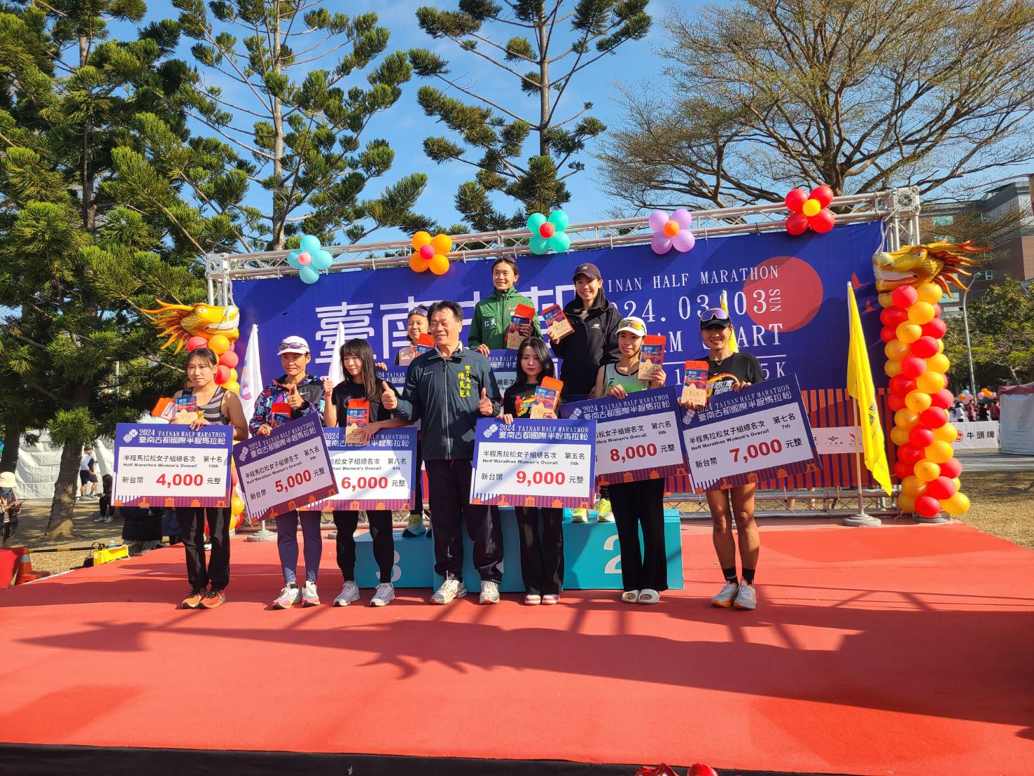 今年賽事高手雲集,競爭十分激烈,半馬男子組總排由來自肯亞的選手George Mbugua Ngure以1小時7分39秒的成績勇奪冠軍,半馬女子組總排則由謝千鶴以1小時18分30秒的成績封后;路跑組(10公里)男子組及女子組總排分別由周鴻宇及董家琪奪下冠軍,葉澤山副市長除了恭喜獲獎選手外,也與跑友相約明年再見!